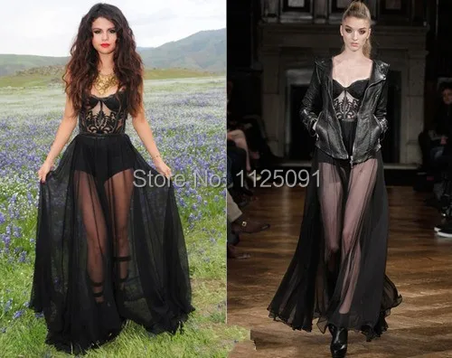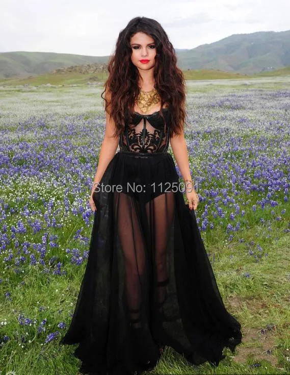 Sexy Amazing Black A-Line Selena Gomez Celebrity Dresses Sweetheart Sheer Bodice Appliques Lace Embellished Chiffon Prom Gowns
